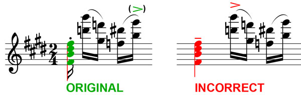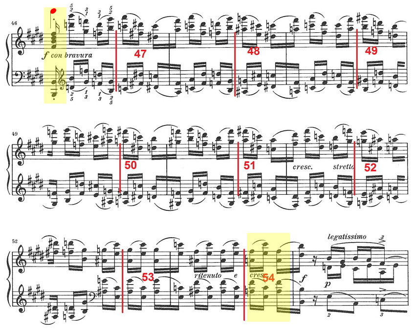 The transformation of the chord on the 1st beat of bar 46 from sixteenth note to quarter note (example 1 above) results in a shift of three sixteenth notes over 8 bars. As a result, Chopin’s entire precise construction falls apart: the forte or sforzato (depending on the edition) at the beginning of bar 54 is moved from the 1st beat to the 4th sixteenth note of the group, the weakest one, and bar 54 thus counts 11 sixteenth notes instead of 8... This is a truly trivial rhythmic distortion, very annoying (comparable to the l’Etude op. 25 n° 2 played at 6/4) and so common that even very good pianists play it this way.